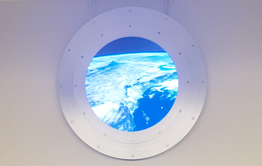 yosh.i / 2022 / 舷窓をモチーフとした直径750mmのアルミニウムフレームと宇宙絶景映像のミクスチュア